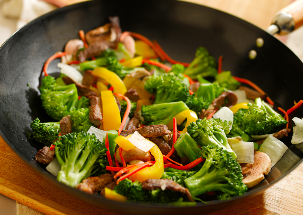 Paista suikaleiksi leikattua kanaa (n. 150 g) ja lisää joukkoon runsaasti värikkäitä kasviksia, kuten paprikaa, parsakaalia ja porkkanaa. Mausta soijalla ja valkosipulilla. Tarjoile täysjyvänuudeleiden (n. 60 g kuivana) tai kevyen riisin kanssa.