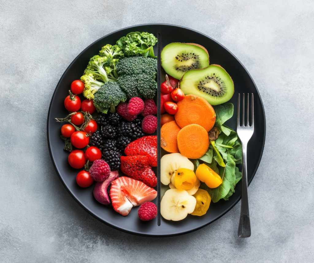 Värit lautasella kertovat vitamiineista – mitä monipuolisempi kirjo, sitä laajempi ravinneprofiili. Punainen, vihreä, oranssi, keltainen ja sininen kertovat eri kasvikunnan vitamiinilähteistä.